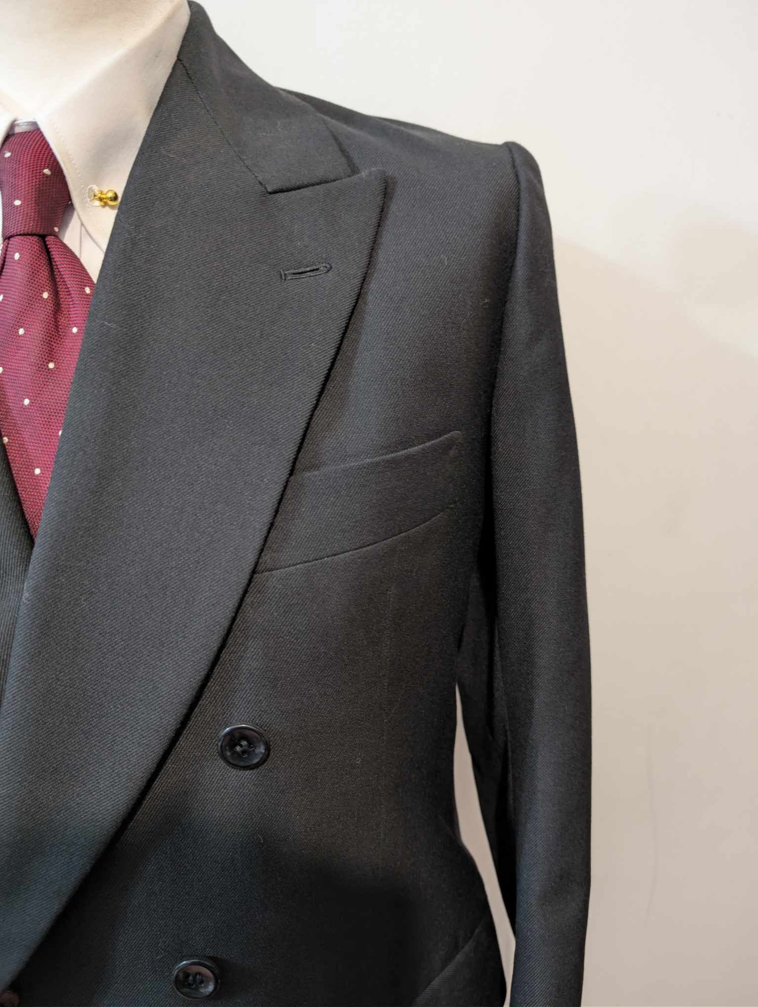 Je vous propose ce sombre costume croisé de couleur noir en laine.