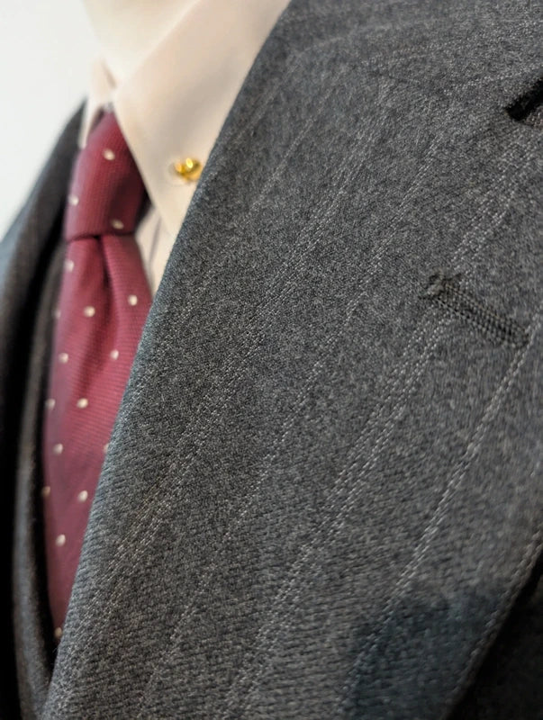 Je vous propose ce spectaculaire costume 3 pièces pinstripe de couleur gris à fines rayures blanche en flanelle de laine.