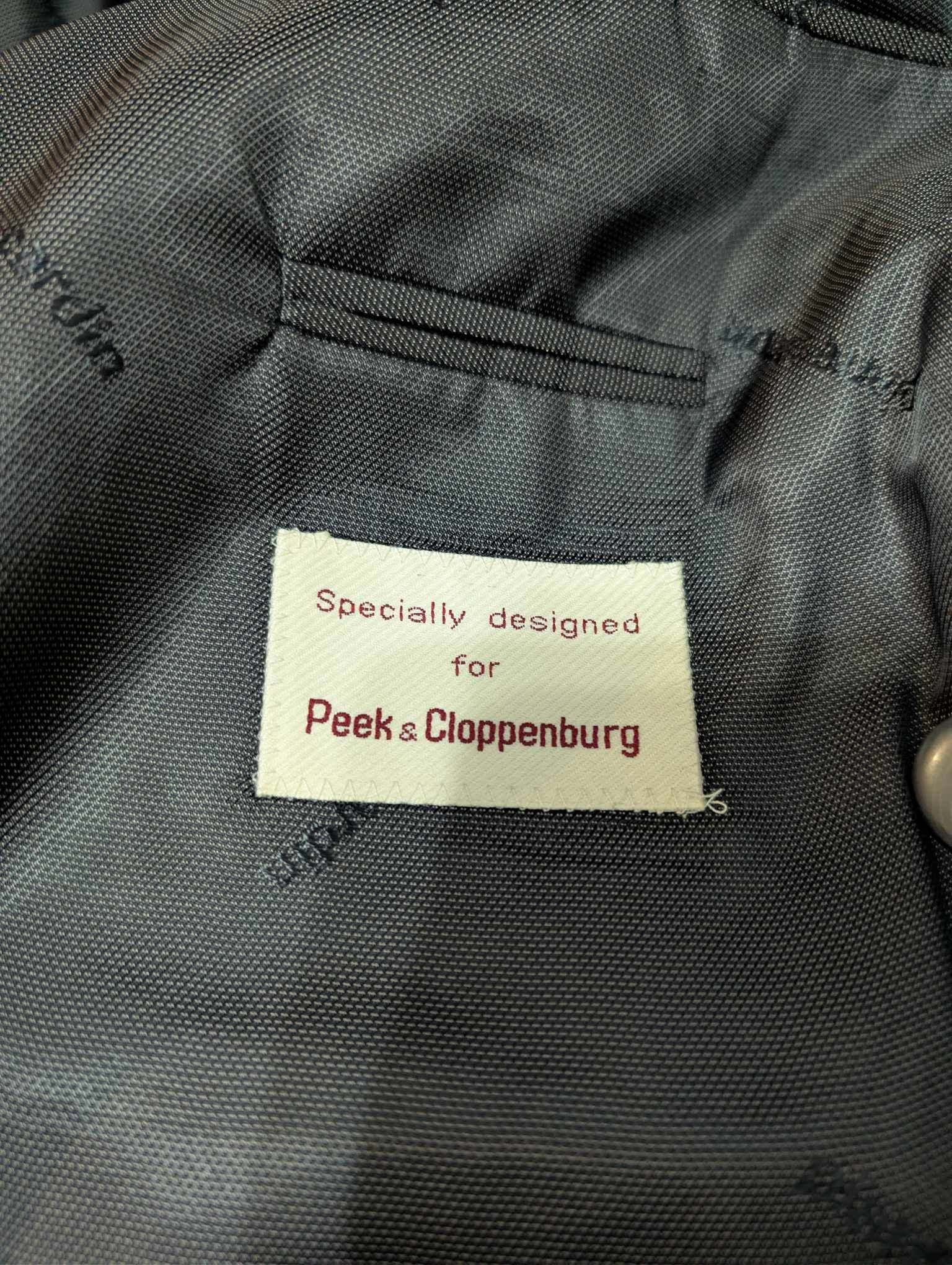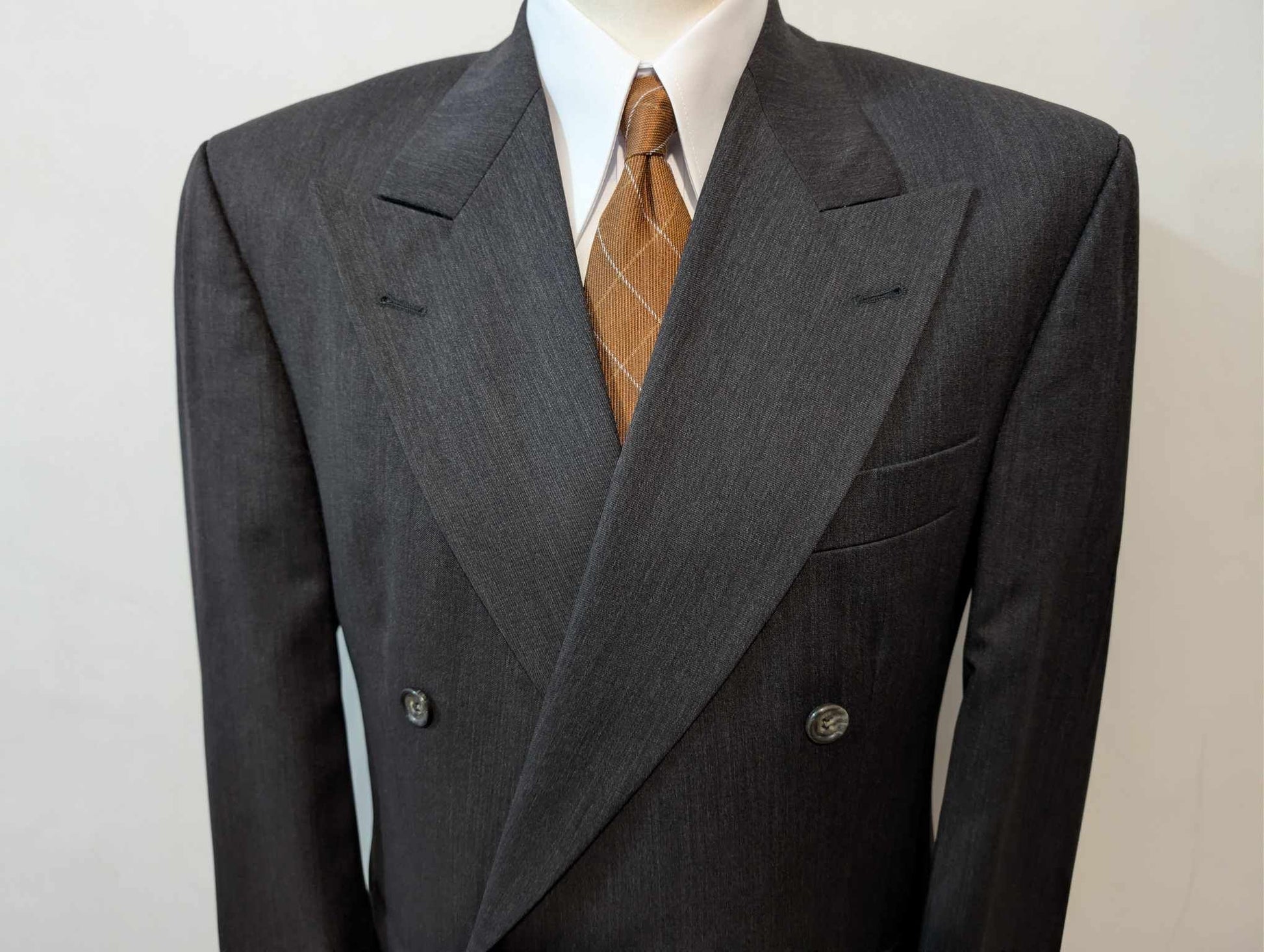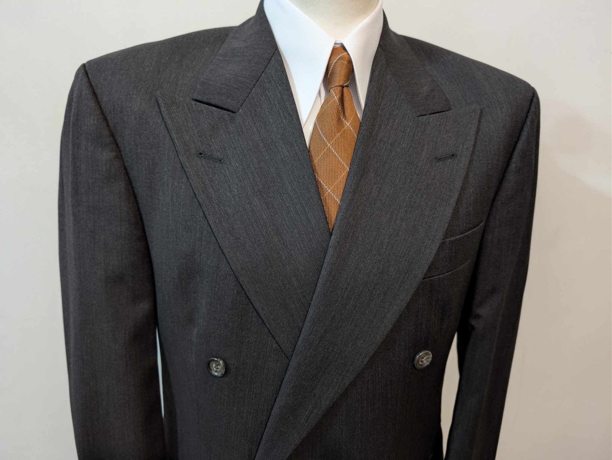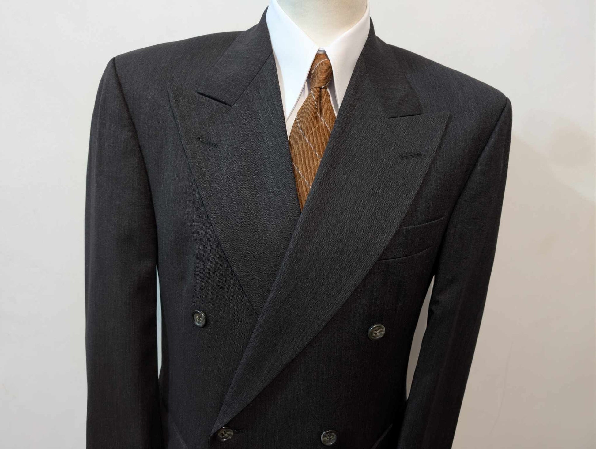 Je vous propose ce splendide costume croisé de couleur gris anthracite presque noir en laine.